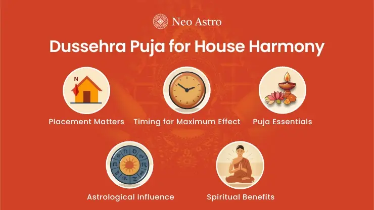 - Astrological Influence: Each house in astrology represents different aspects of life, wealth, health, relationships, and career. Conducting Dussehra Puja helps channel planetary energies positively, especially for key houses like the 1st (self), 4th (home), and 7th (relationships), creating balance and goodwill.